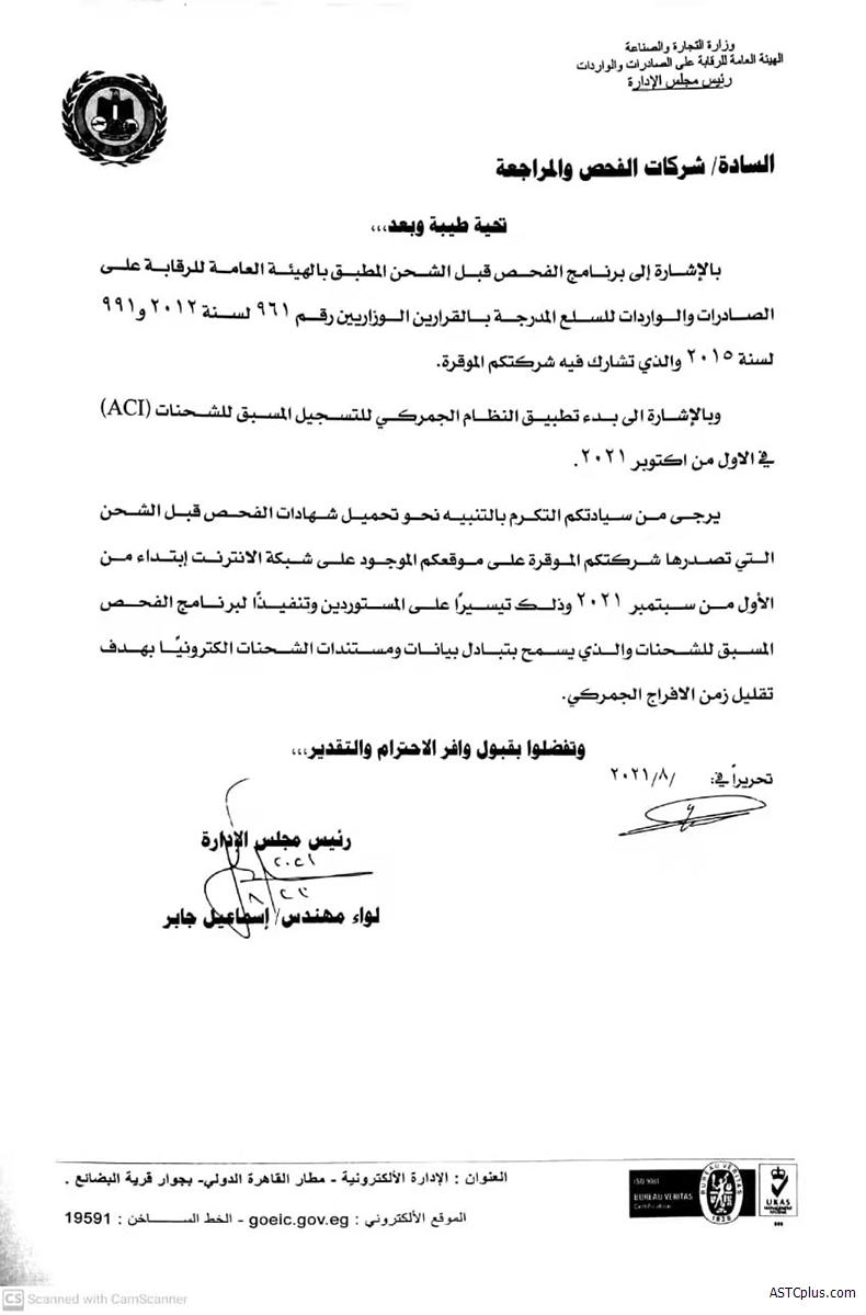 With reference to the pre-shipment inspection program implemented by the General Organization for Export and Import Control of Commodities listed in Ministerial Resolutions No. 961 of 2012 and No. 991 of 2015. And with reference to the introduction of the Customs System for Advance Registration of Shipment (ACI) on October 1, 2021.